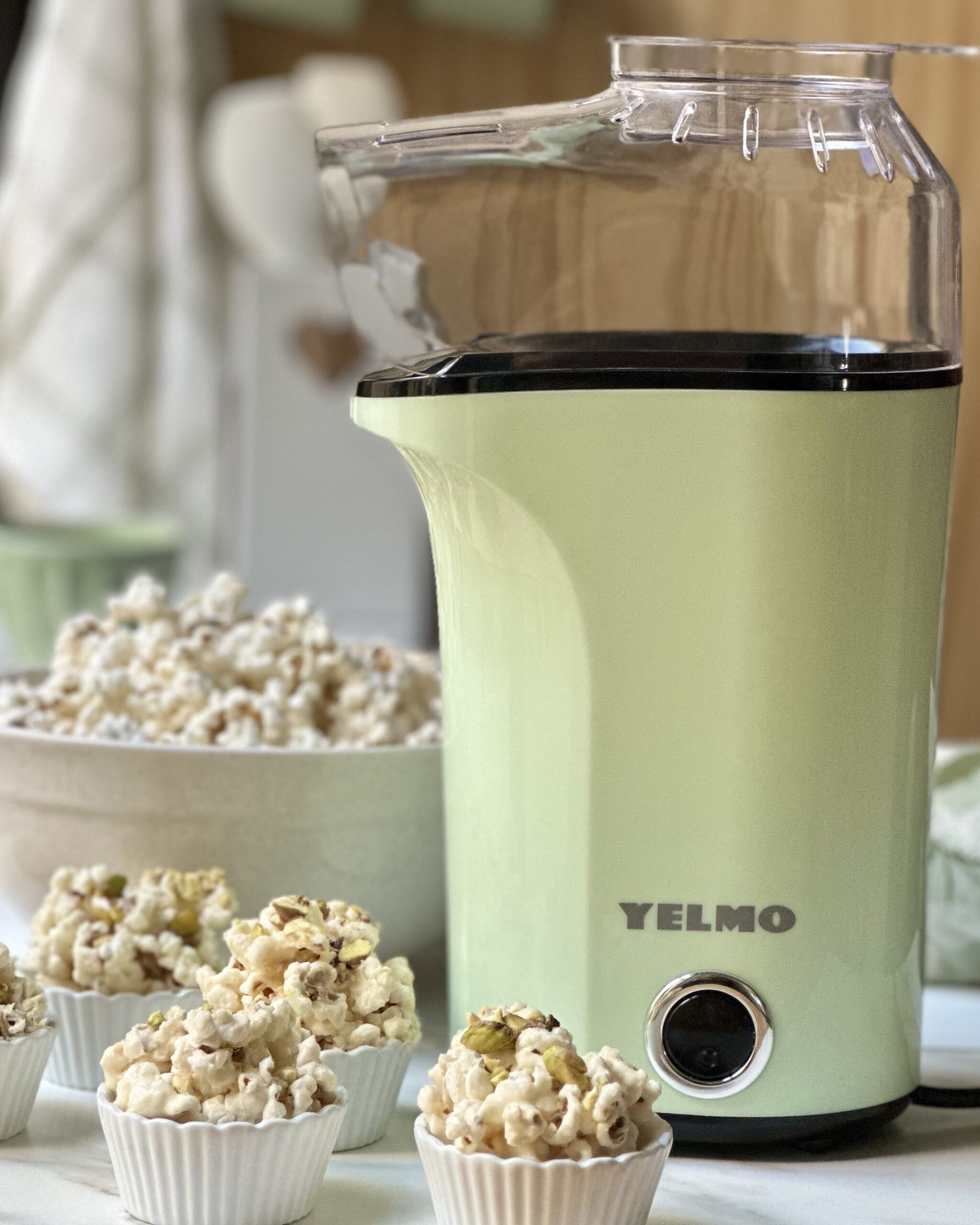 Pochoclos bañados en chocolate blanco y pistachos